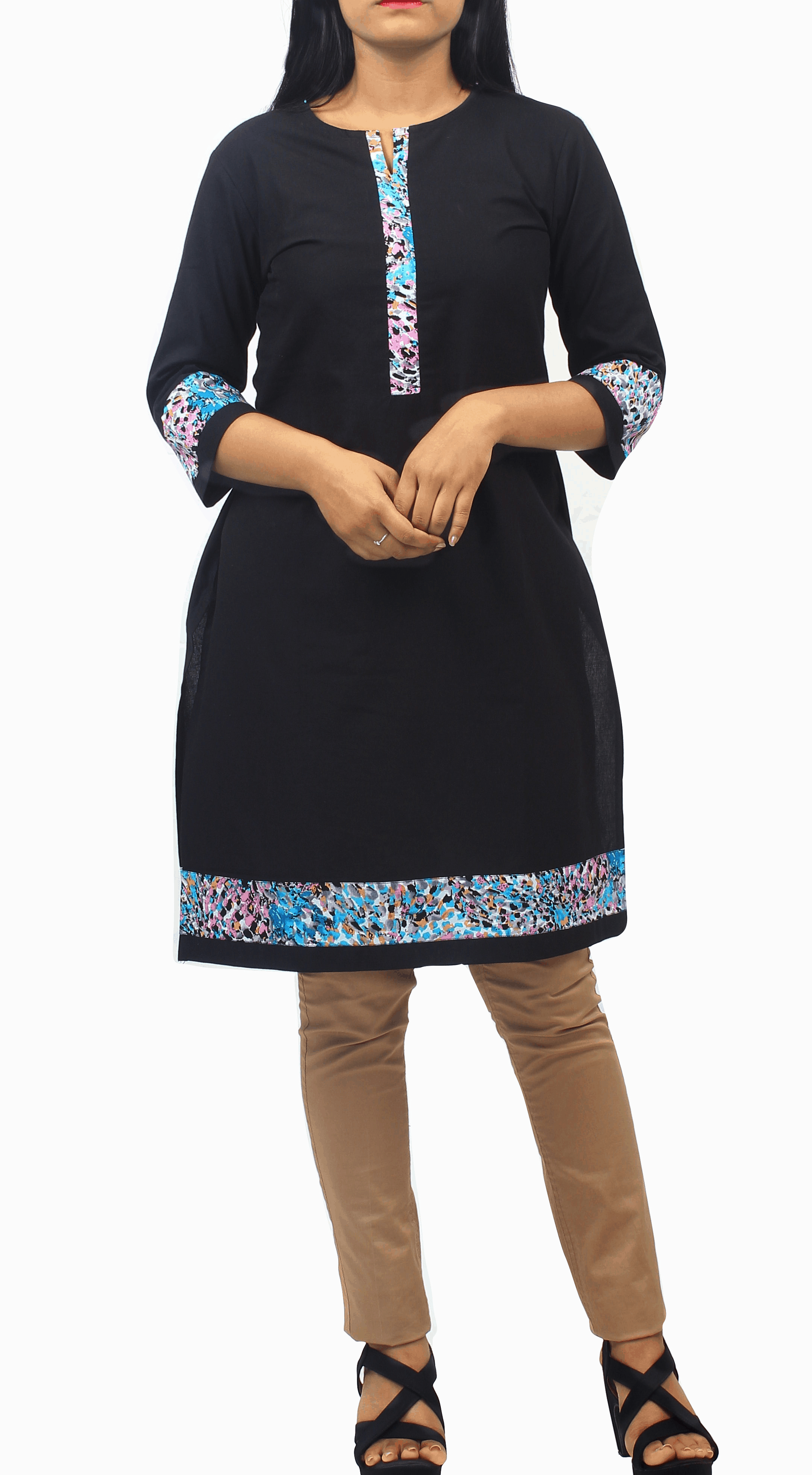 Black Cotton Kurti with Aqua Blue, Pink and Black Abstract Print Fabric Details-ROK066B