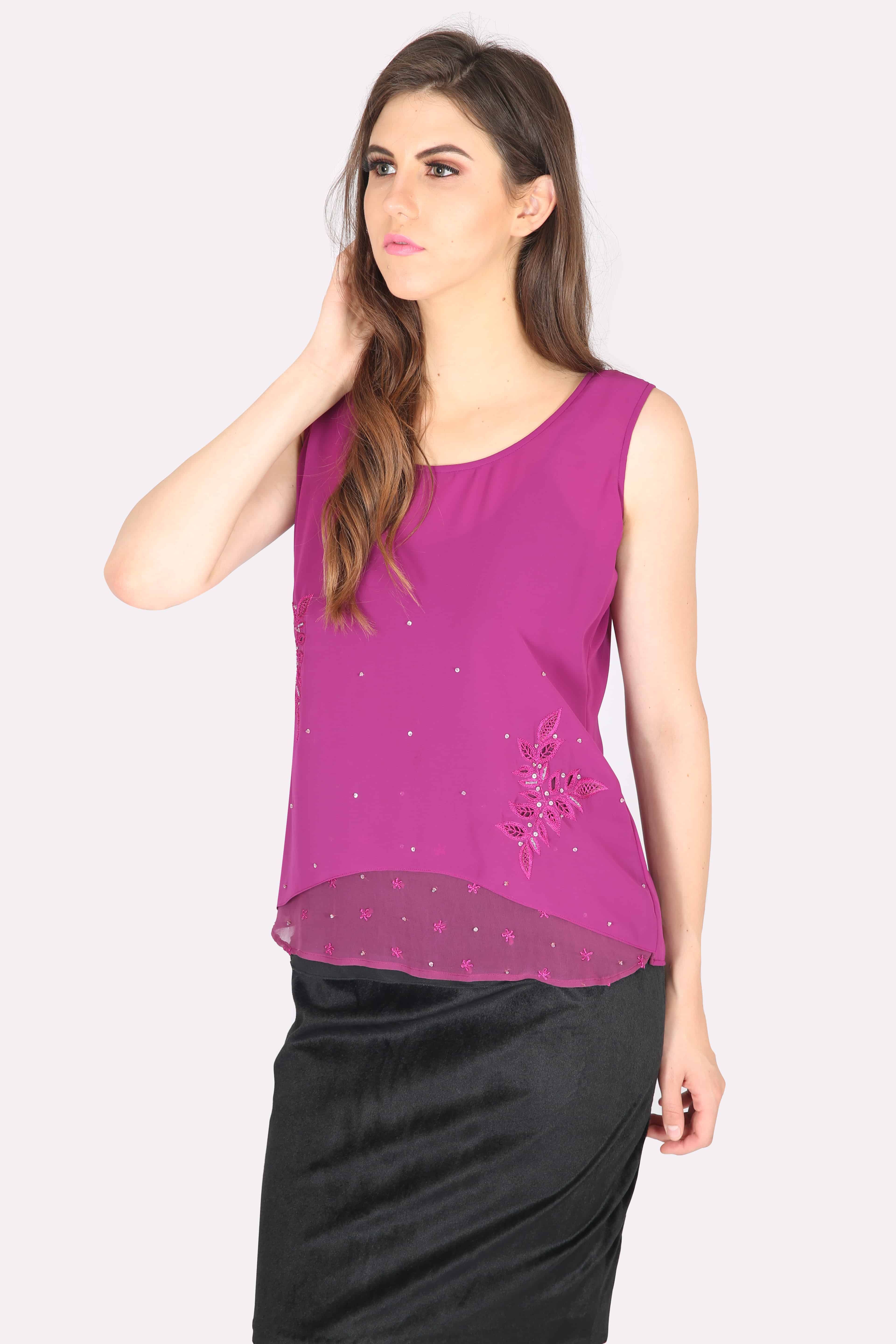 Dark Purple color Tunic Top with Beads & Pearls Embellished Neckline-ROK006