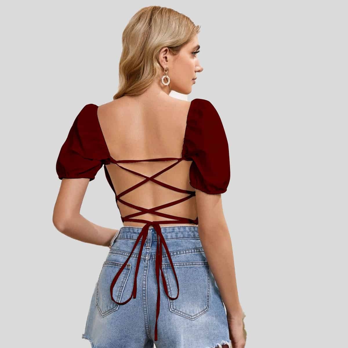 Wine Red Lace Up Back Rucked Front Crop Top-RCT023