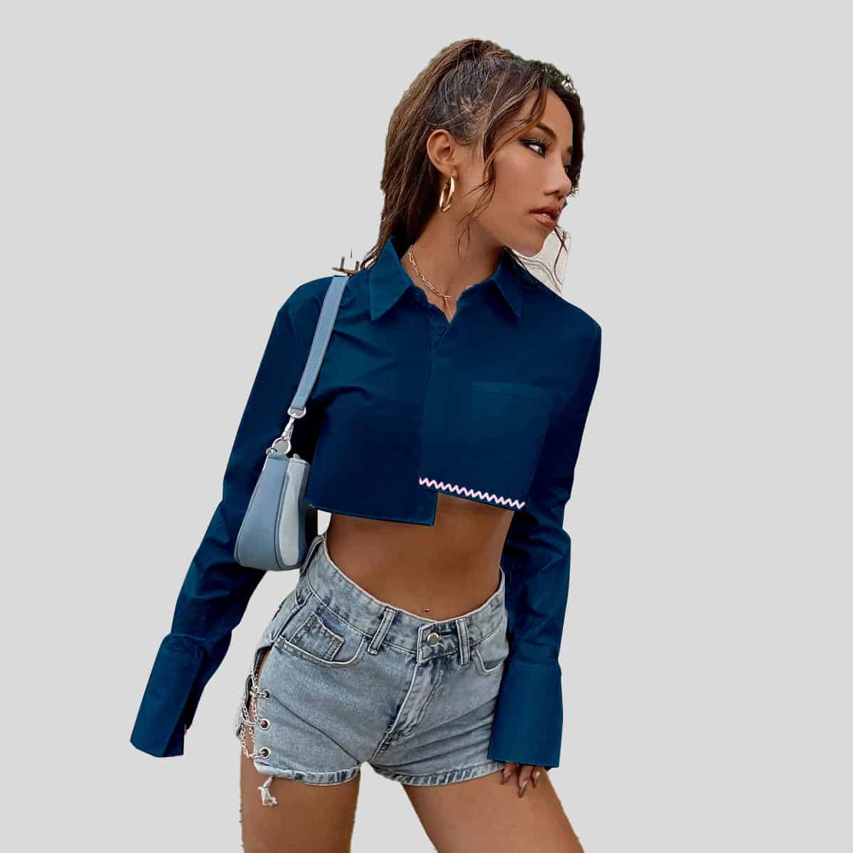 Prussian Blue Button Front Crop T-shirt-RCT035