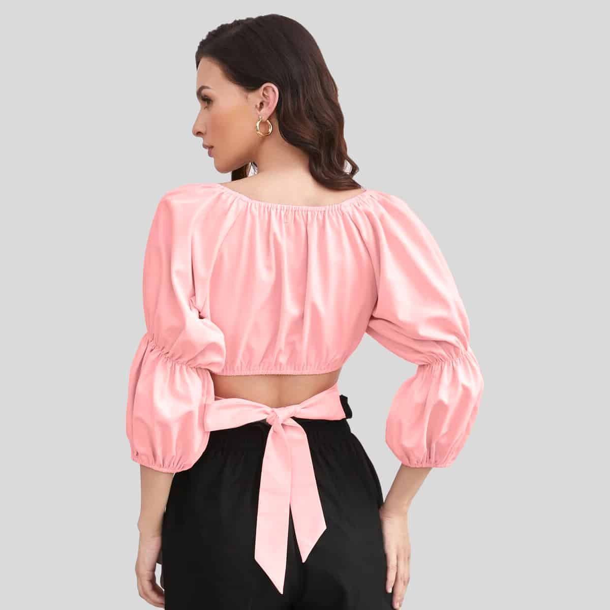 Baby pink Rucked Puff Sleeve Cut Out Mock Neck Top-RCT032
