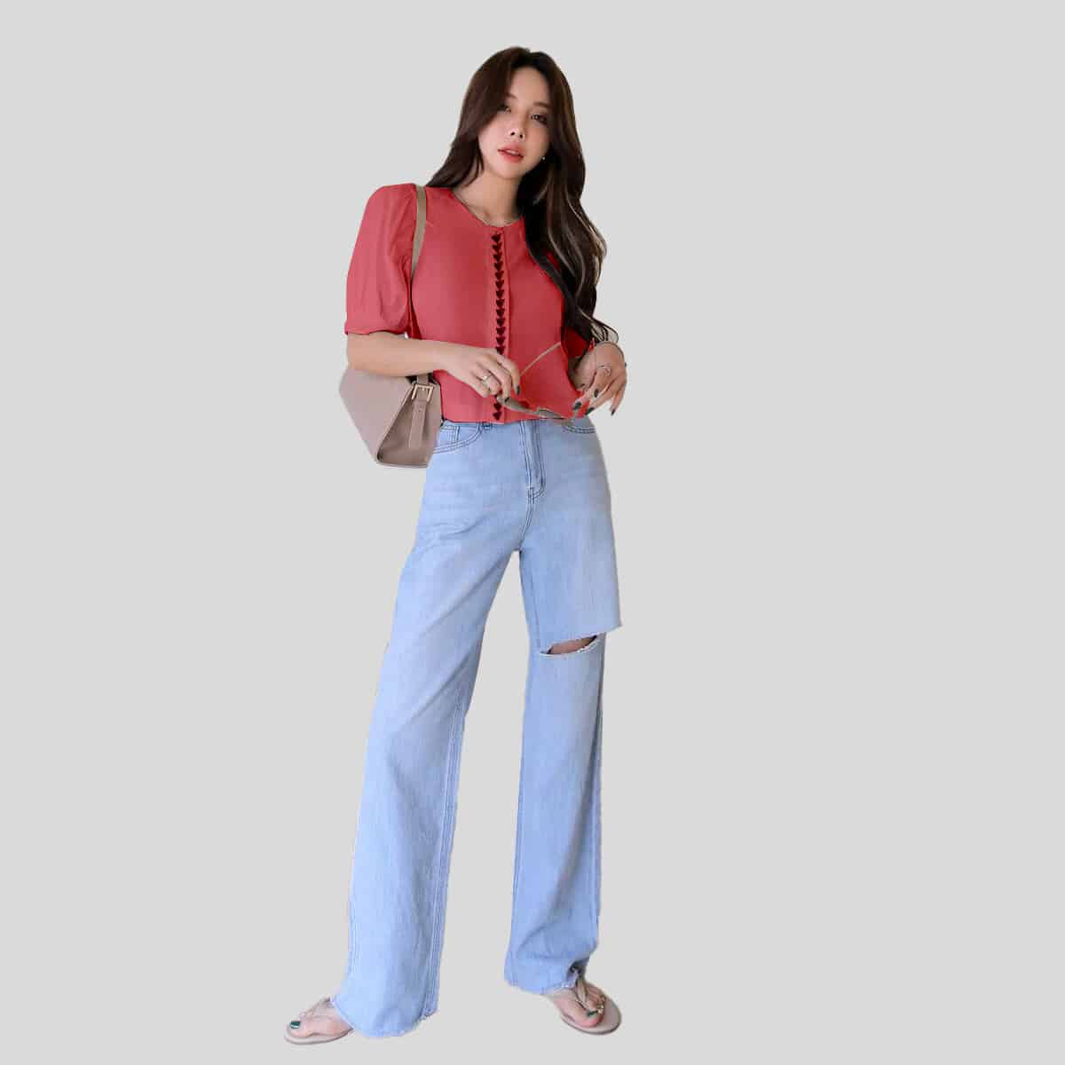 Peach Knotted Cuff Button Up Blouse-RCT022