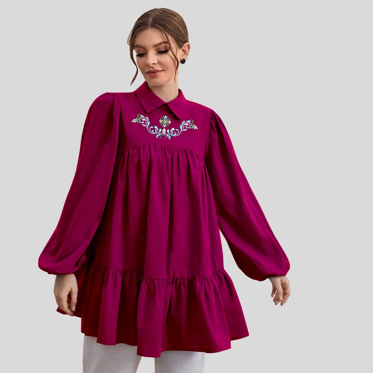 White Short Tunic Top with Lavender Thread Embroidery Details-ROK008
