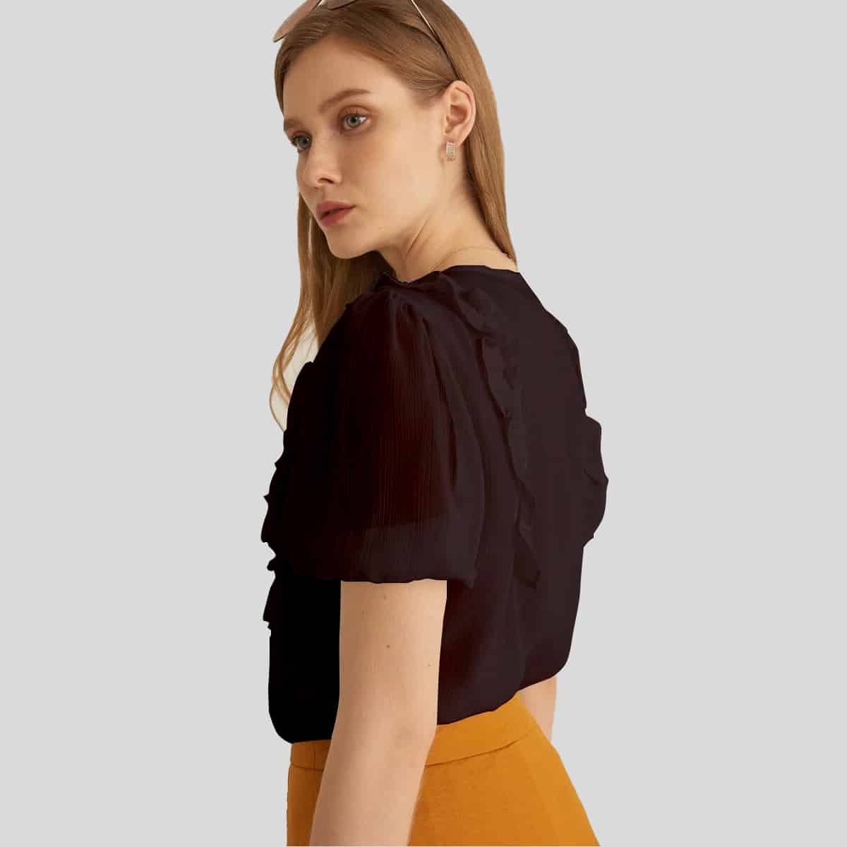 Yellow Rucked Puff Sleeve Cut Out Mock Neck Top-RCT033