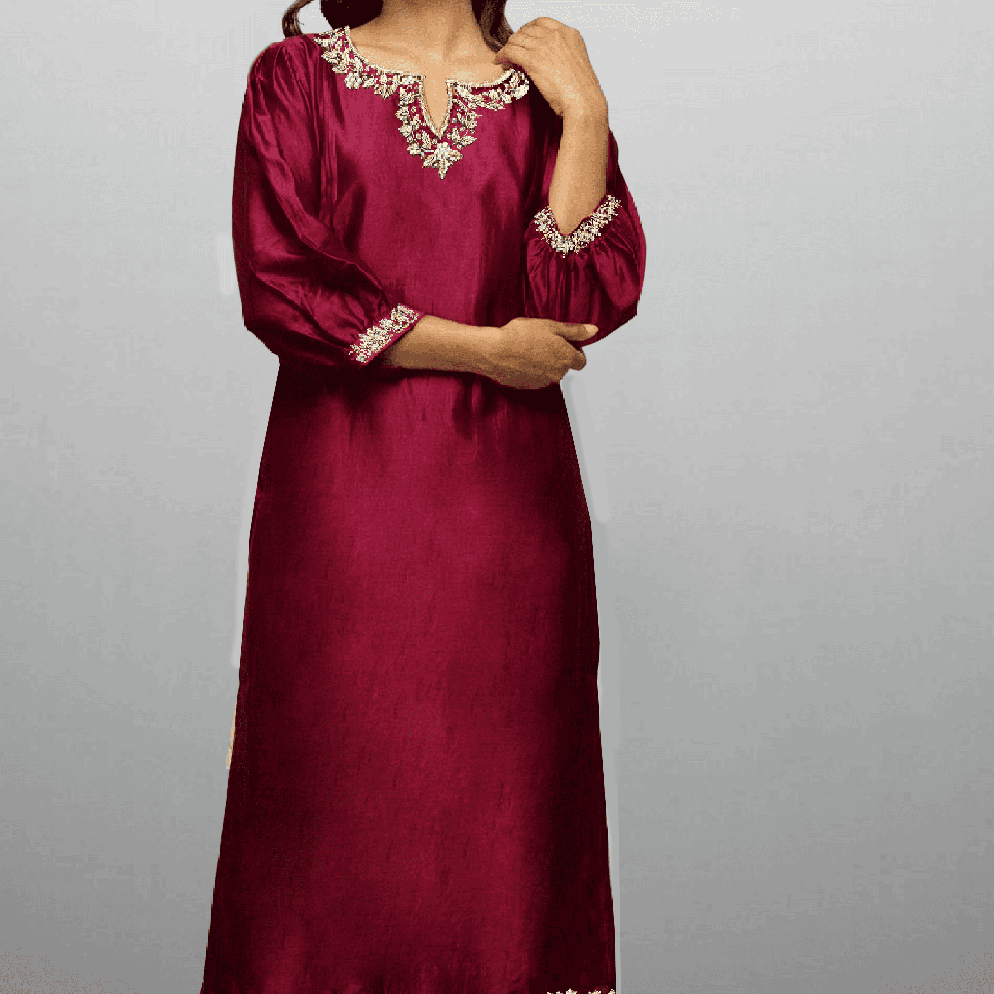 Women's Light Mahogany Pearl neckline embellished kurti with Pant - RWKS105
