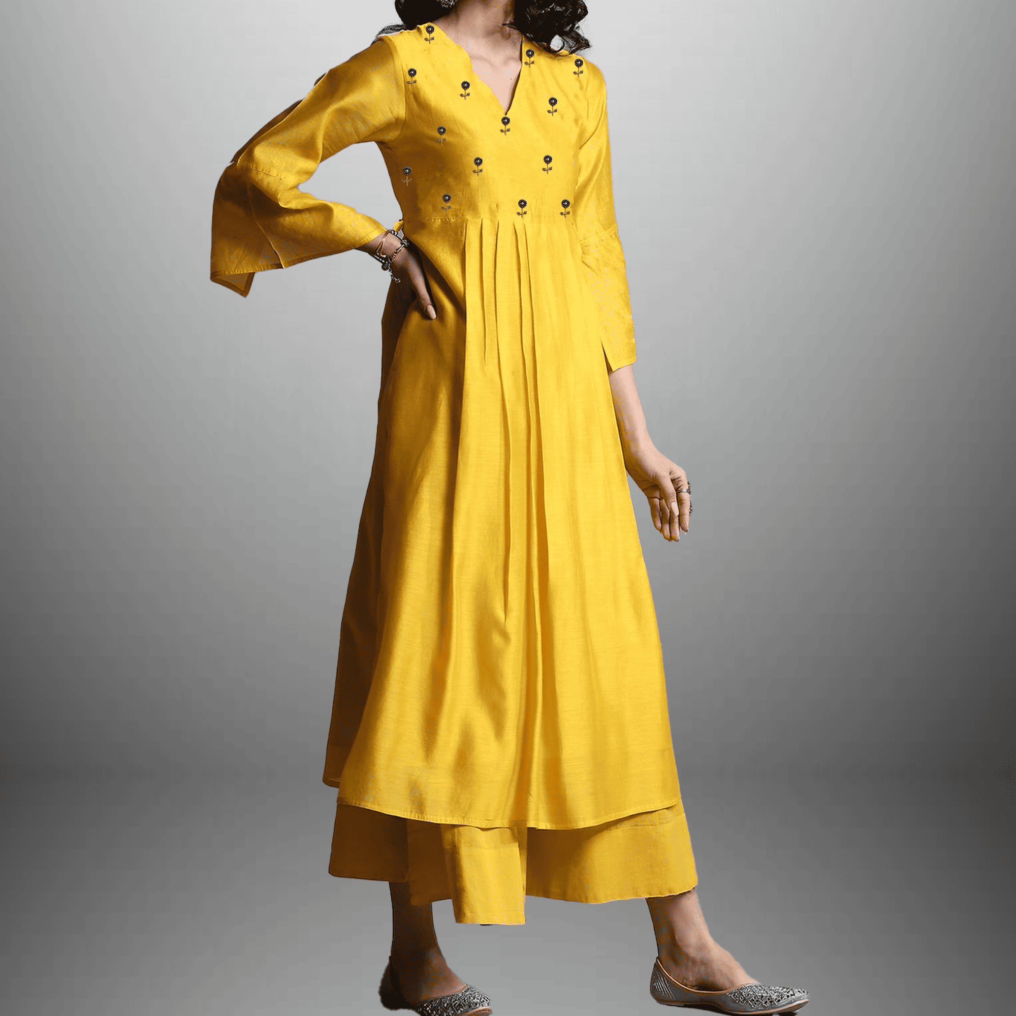 Women's Yellow Kurti With Front Embroidery with Bottom and Dupatta-RWKS098