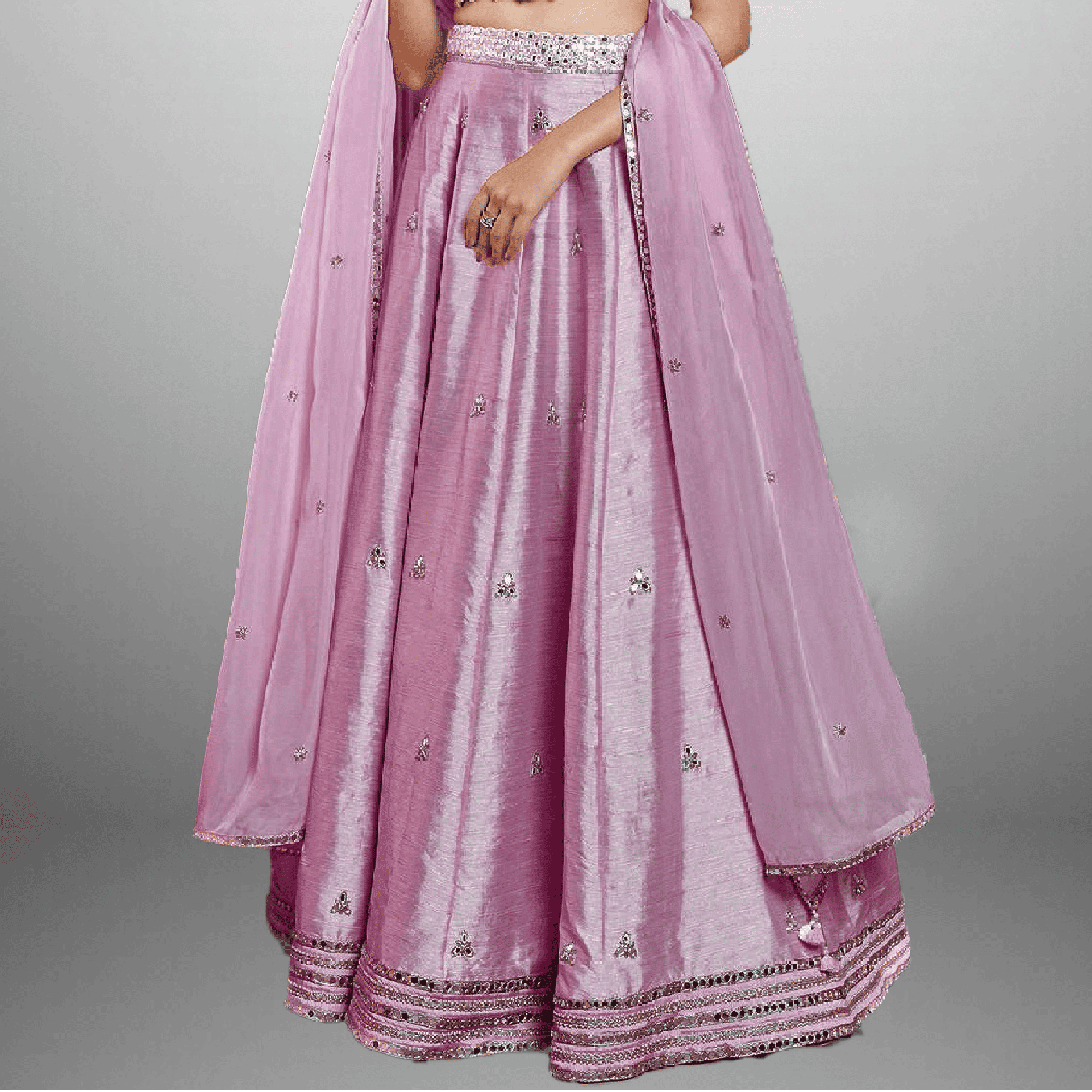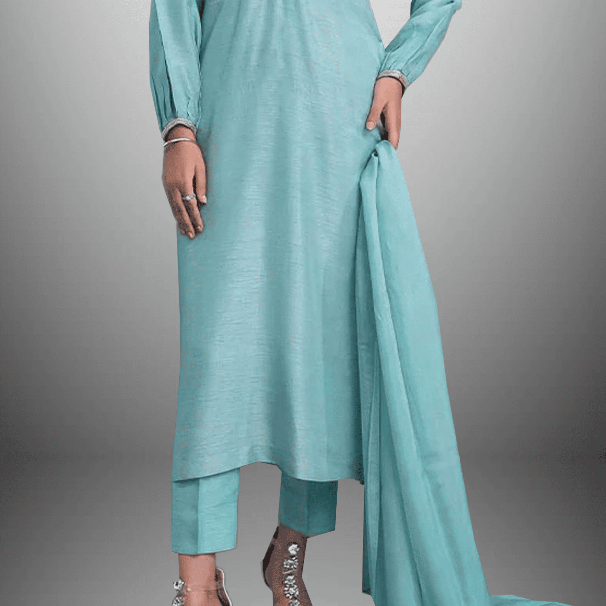 Women's Sky Gray Front Pearl Embellished kurti with Sleeve laces And Bottom and Dupatta-RWKS099
