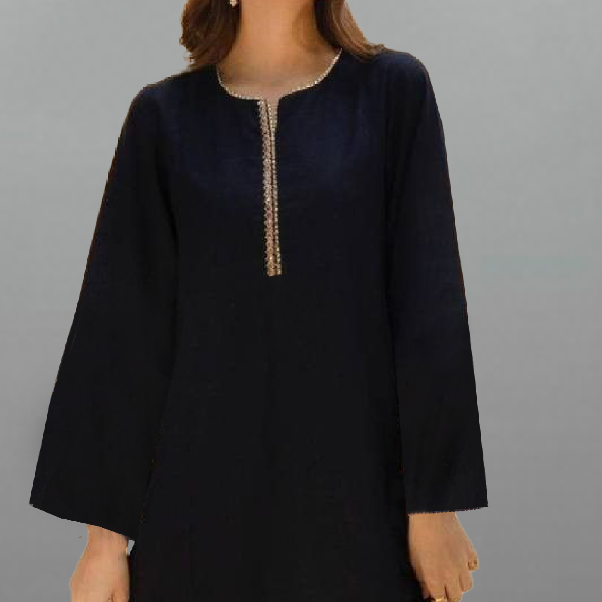 Black Short Tunic Top with Blue Aqua Stone Neckline and Gold Thread Embroidery-ROK017
