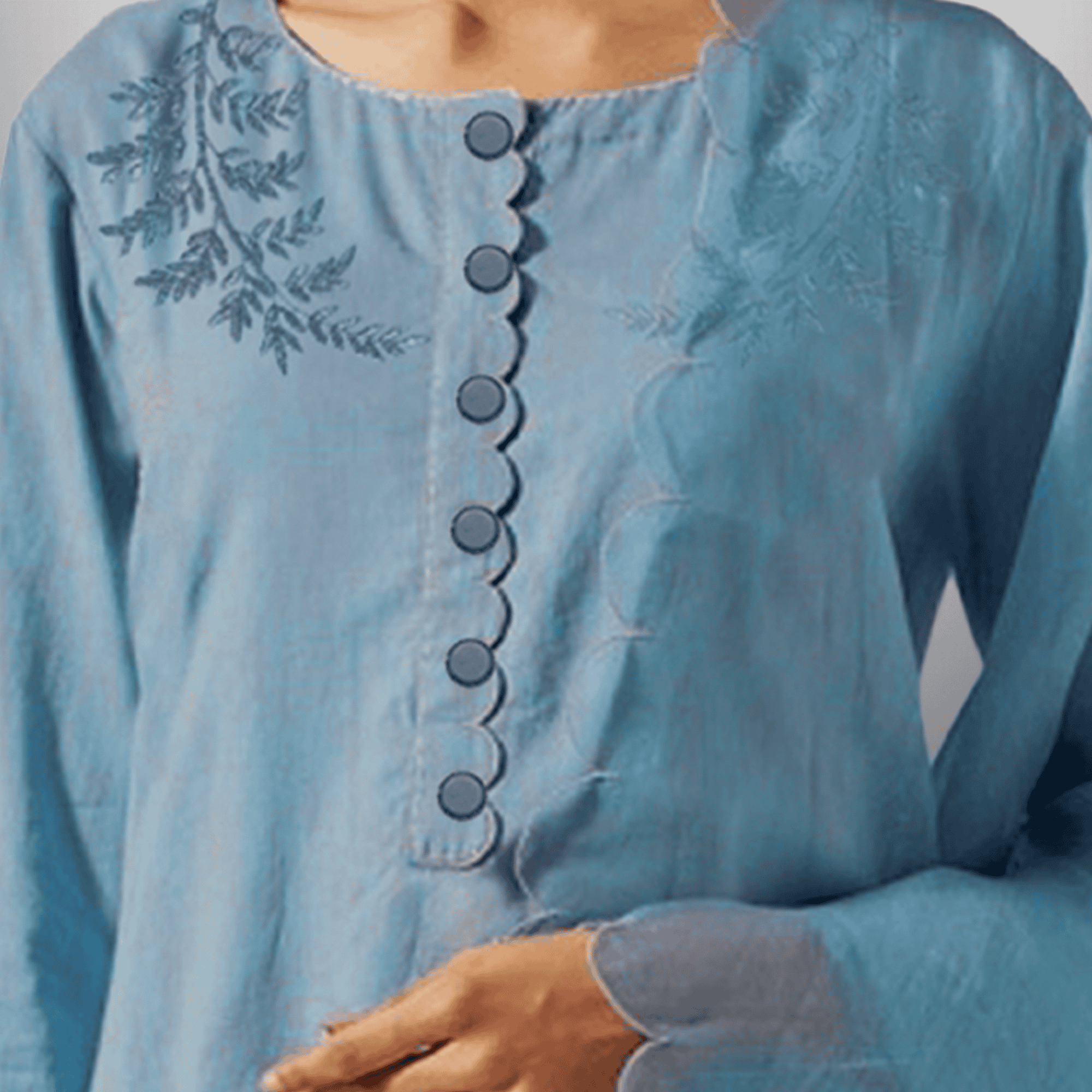Women's Ice-Blue Calf length Kurti with Front embroidery and Scalloped dupatta with Pant-RWKS092