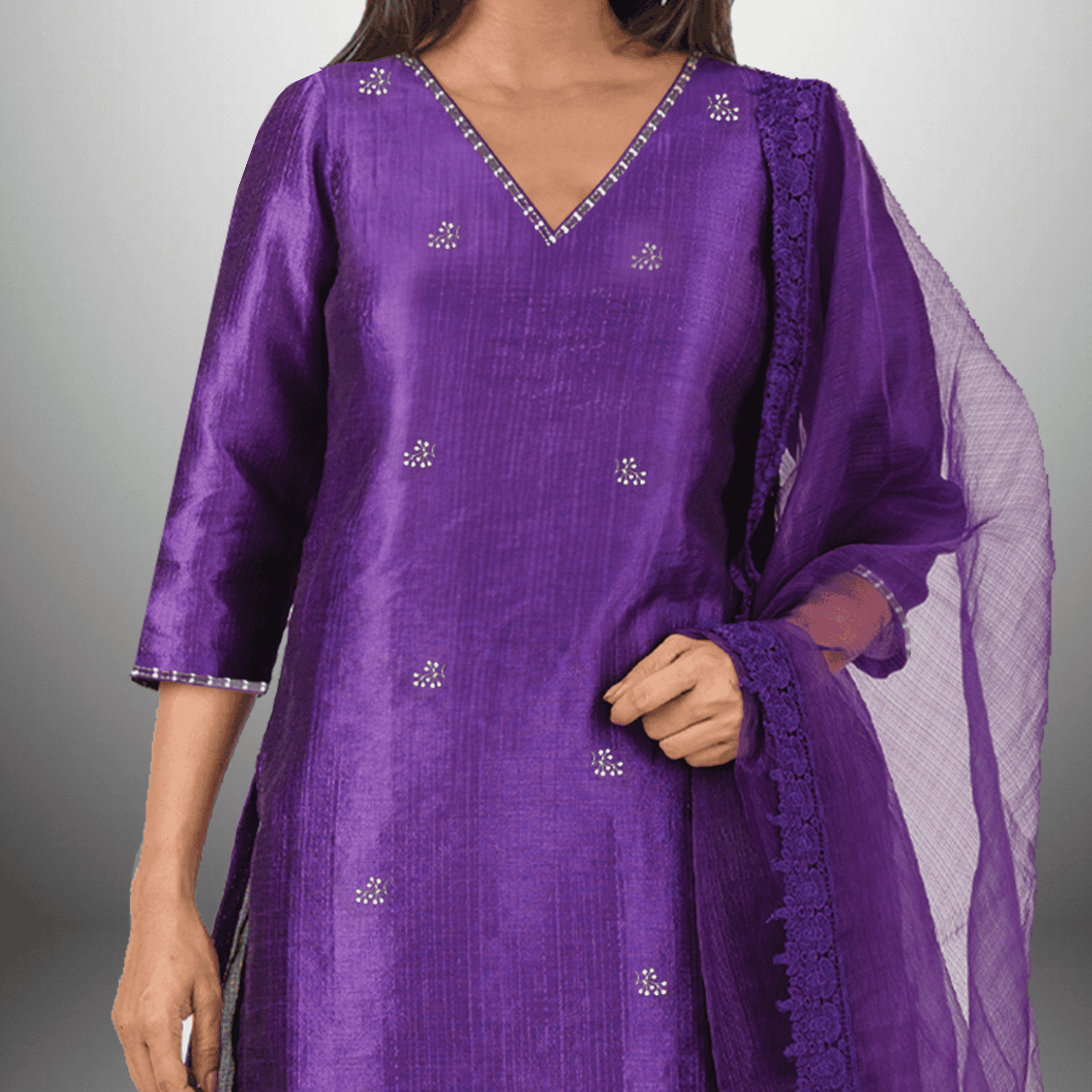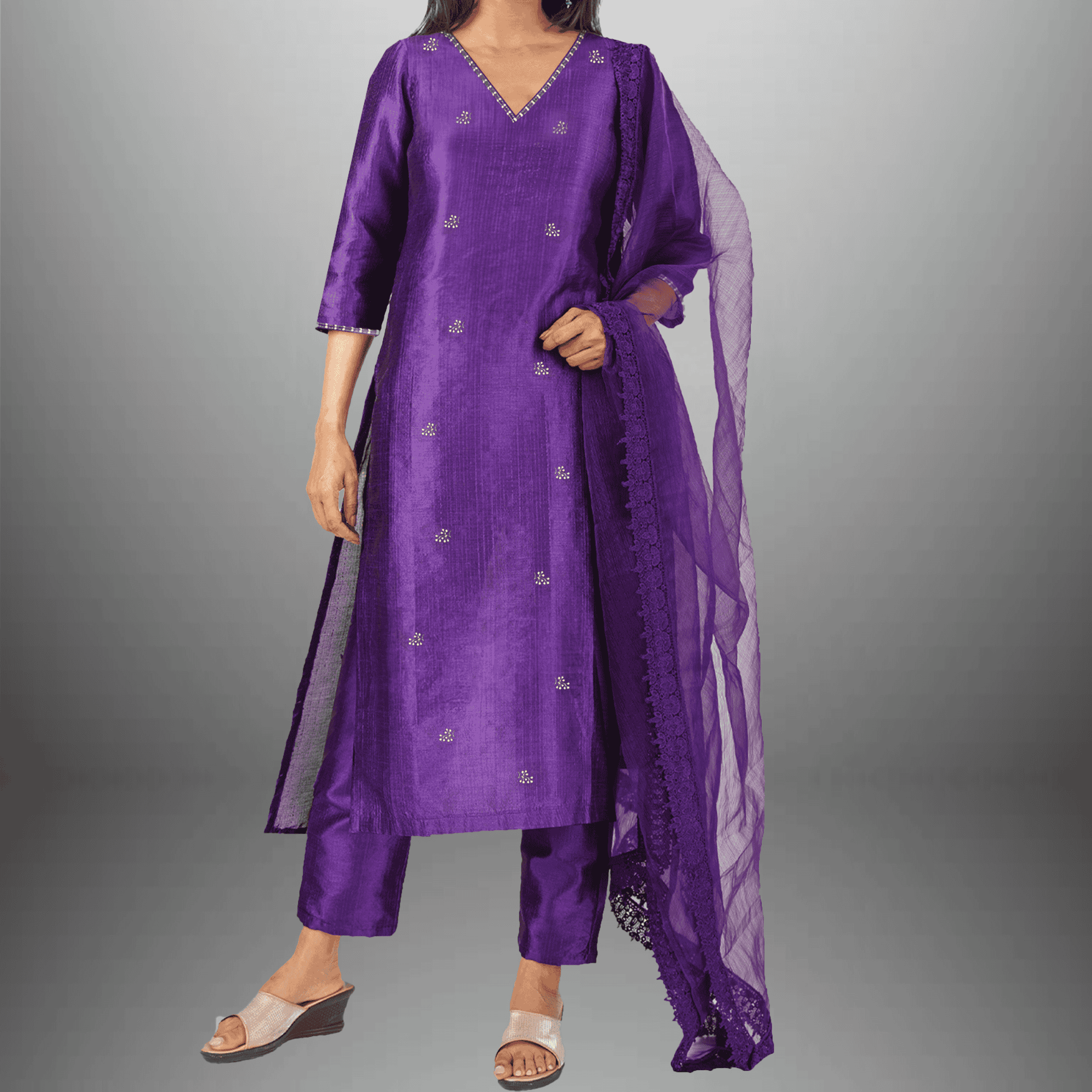 Women's Purple Kurti With Neckline lace work and Butta embroidery Along with Pant and Lace embellished Dupatta - RWKS102